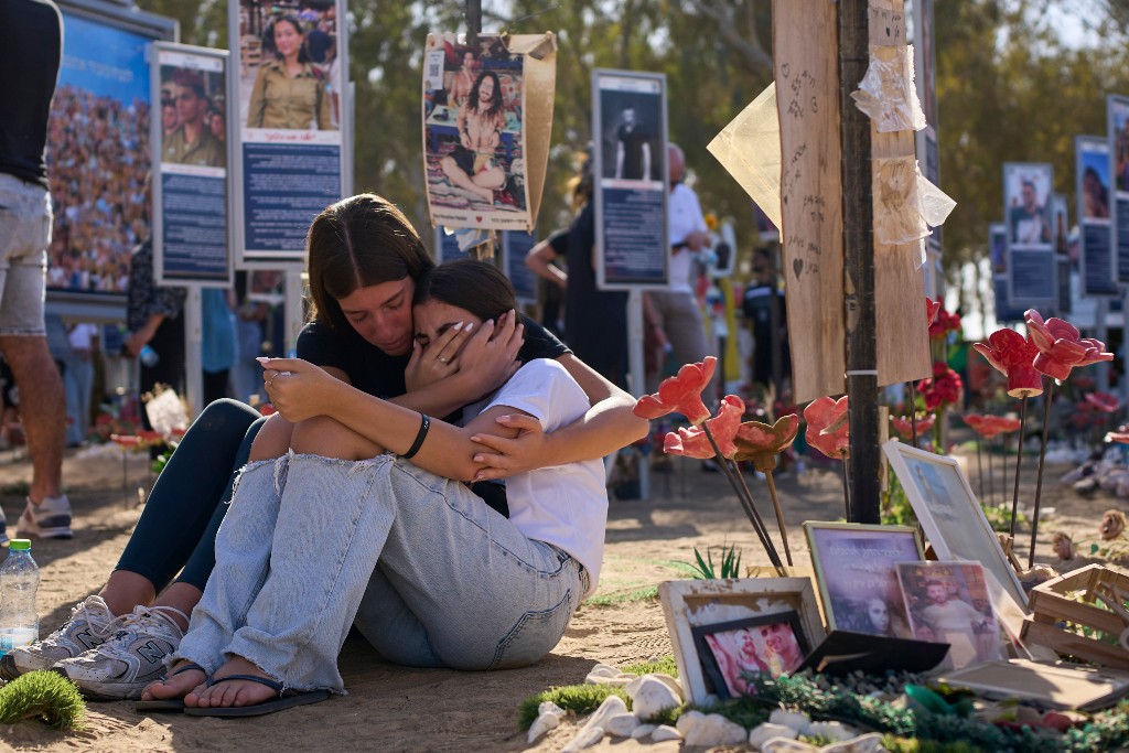 Kvinnor sörjer vid platsen för Novafestivalen där många dödades och kidnappades i Hamas attack den 7 oktober 2023. Foto: AP Photo/Ohad Zwigenberg