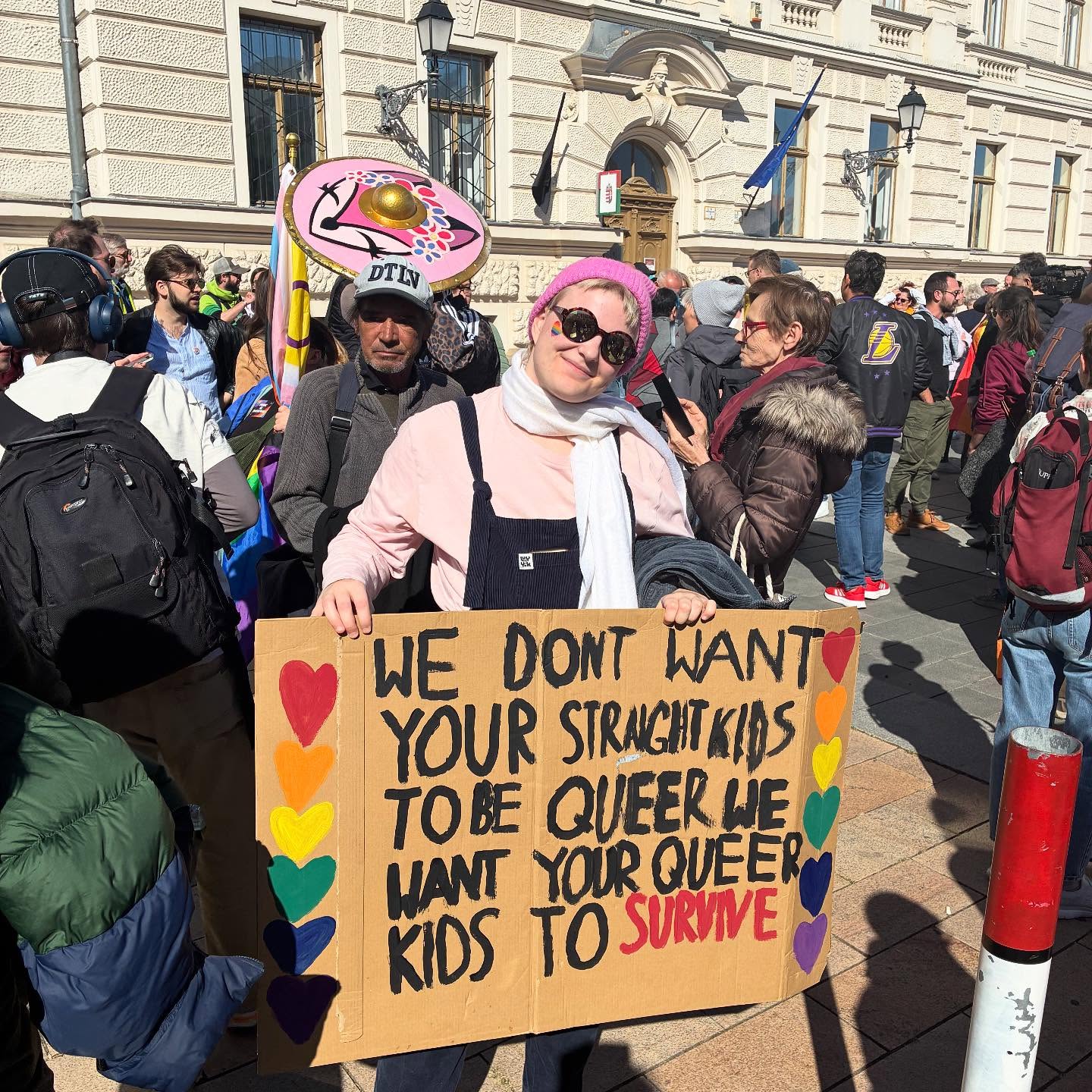 ”Vi vill inte att era heterobarn ska bli queer, vi vill att era queera barn ska överleva” står det på plakatet, en referens till att Orbanregeringen har motiverat sitt Prideförbud med att ”skydda barn”. Foto: Ulrika Westerlund