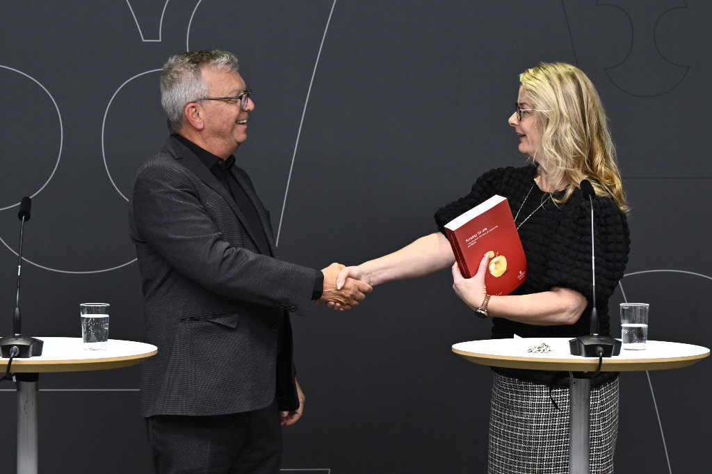 Skolminister Lotta Edholm (L) och tar emot betänkandet från Lärosplansutrdningens särskilda utredare Thomas Persson, under en pressträff  i februari i år. Foto: Axel Narving/TT