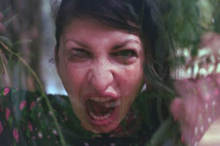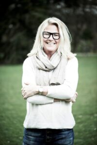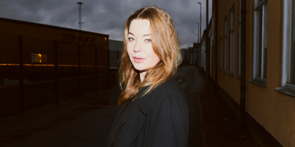 Emma Kronborg i svarta kläder med skog i bakgrunden