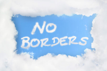 Ett broderi med två händer som kommer ut från en blå cirkel