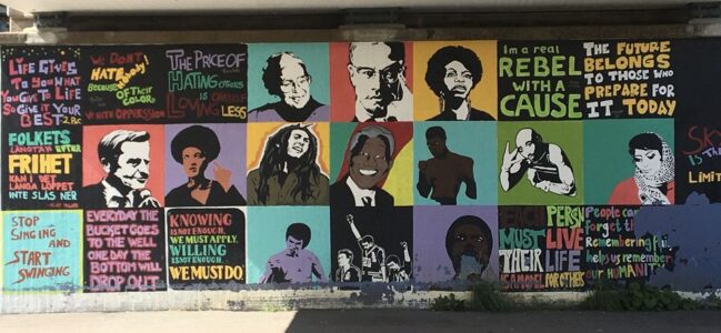 bild med fredstecken, en knuten hand ett hjärta och symbolen för feminist