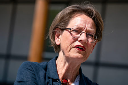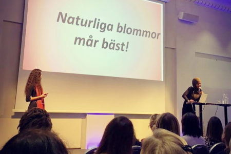 Alice Bah Kuhnke i vit klänning med stora sommarblommor
