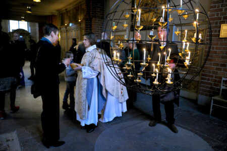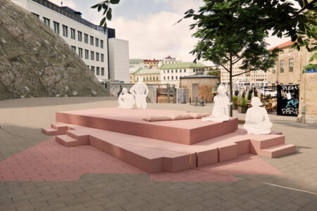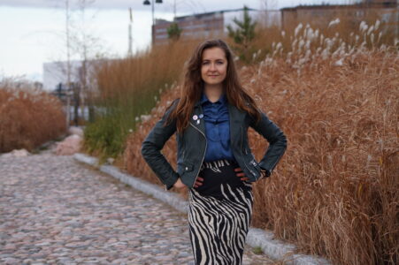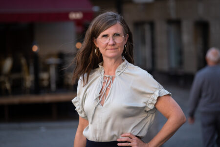 Camilla Andersson i svart klänning och lång fläta. I bakgrunden stadshuset i Stockholm
