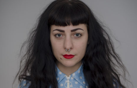 Sara Parkman står framåtlutad med hörlurar och tungan ute