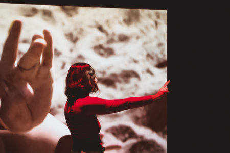 Anna Blomberg på scenen i kostym llyfter upp armarna.