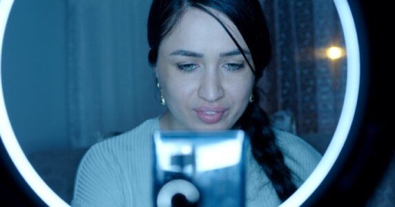 Händerna just ovanför axlarna – tillsammans framför skärmen
